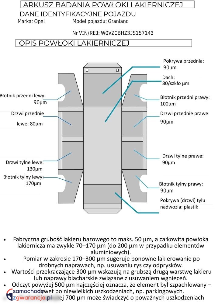 ✅ Każdy samochód przed trafieniem do sprzedaży jest dokładnie sprawdzany pod kątem usterek mechanicznych oraz stanu lakierniczego. Na zdjęciu widoczny jest arkusz badania powłoki lakierniczej, przedstawiający jej grubość.