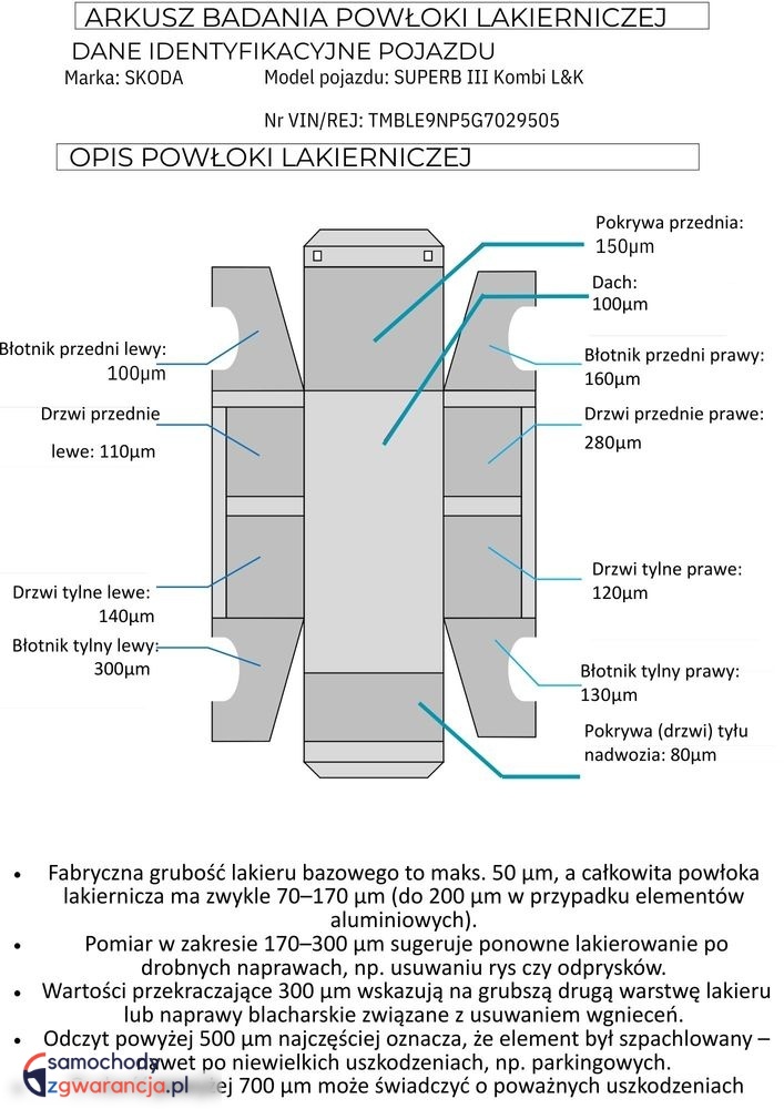 ✅ Każdy samochód przed trafieniem do sprzedaży jest dokładnie sprawdzany pod kątem usterek mechanicznych oraz stanu lakierniczego. Na zdjęciu widoczny jest arkusz badania powłoki lakierniczej, przedstawiający jej grubość.
